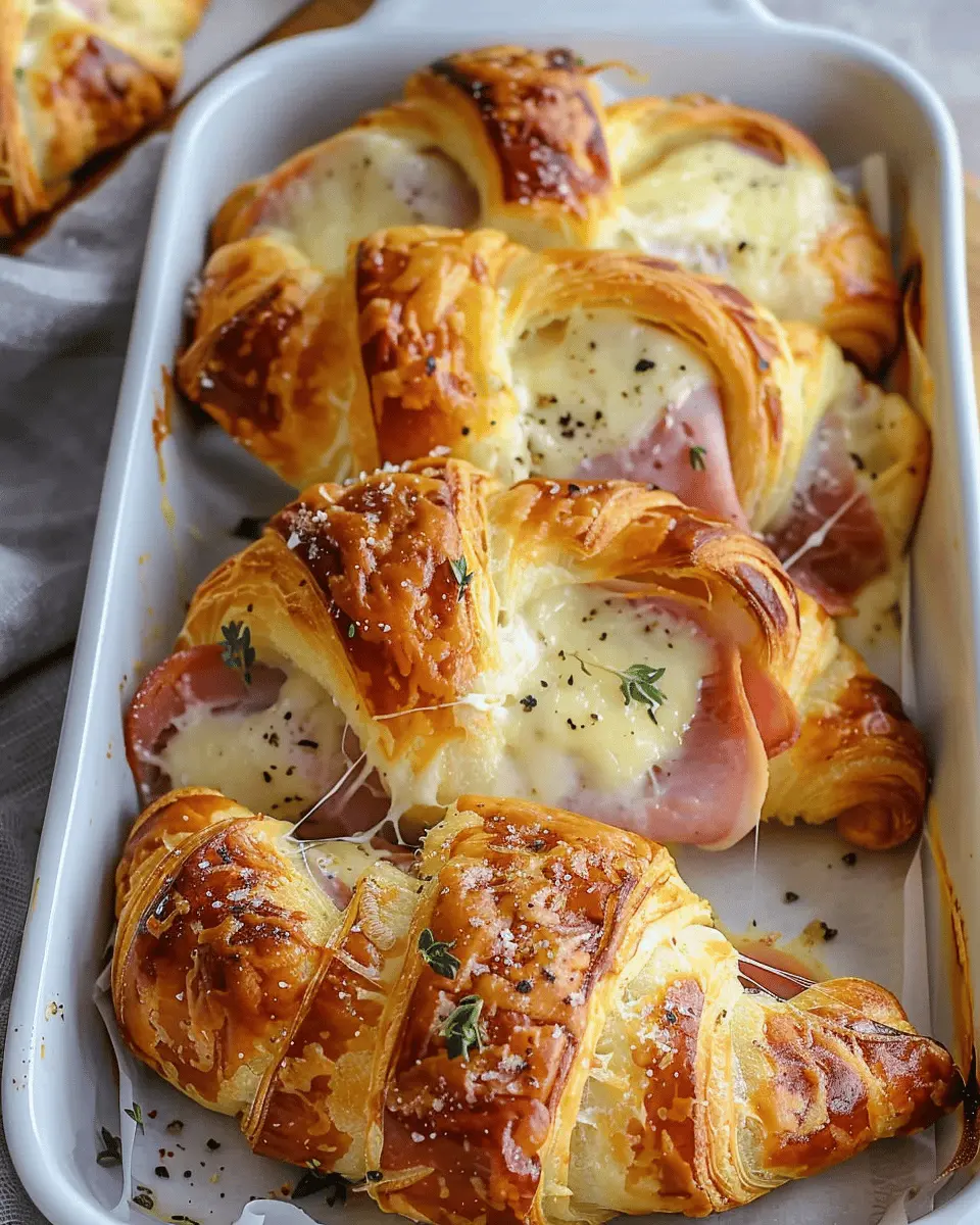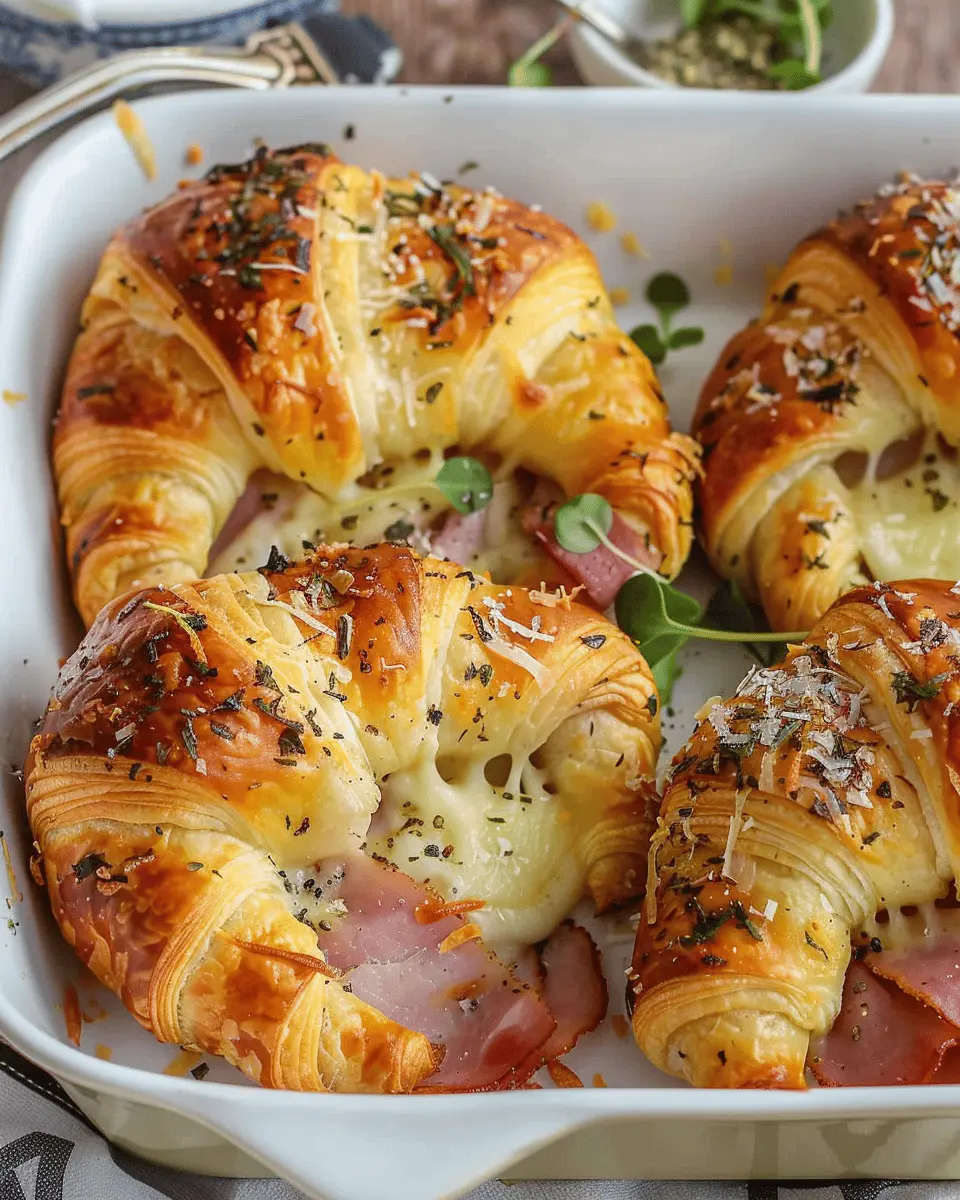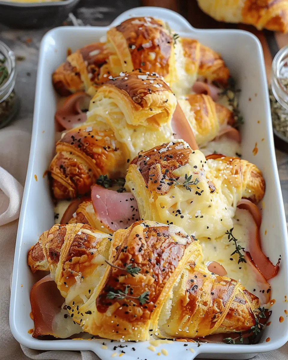 Serving Suggestions: Pair your baked ham and cheese croissants with a fresh salad or soup for a balanced meal. For a delightful drink option, serve with freshly brewed herbal tea.