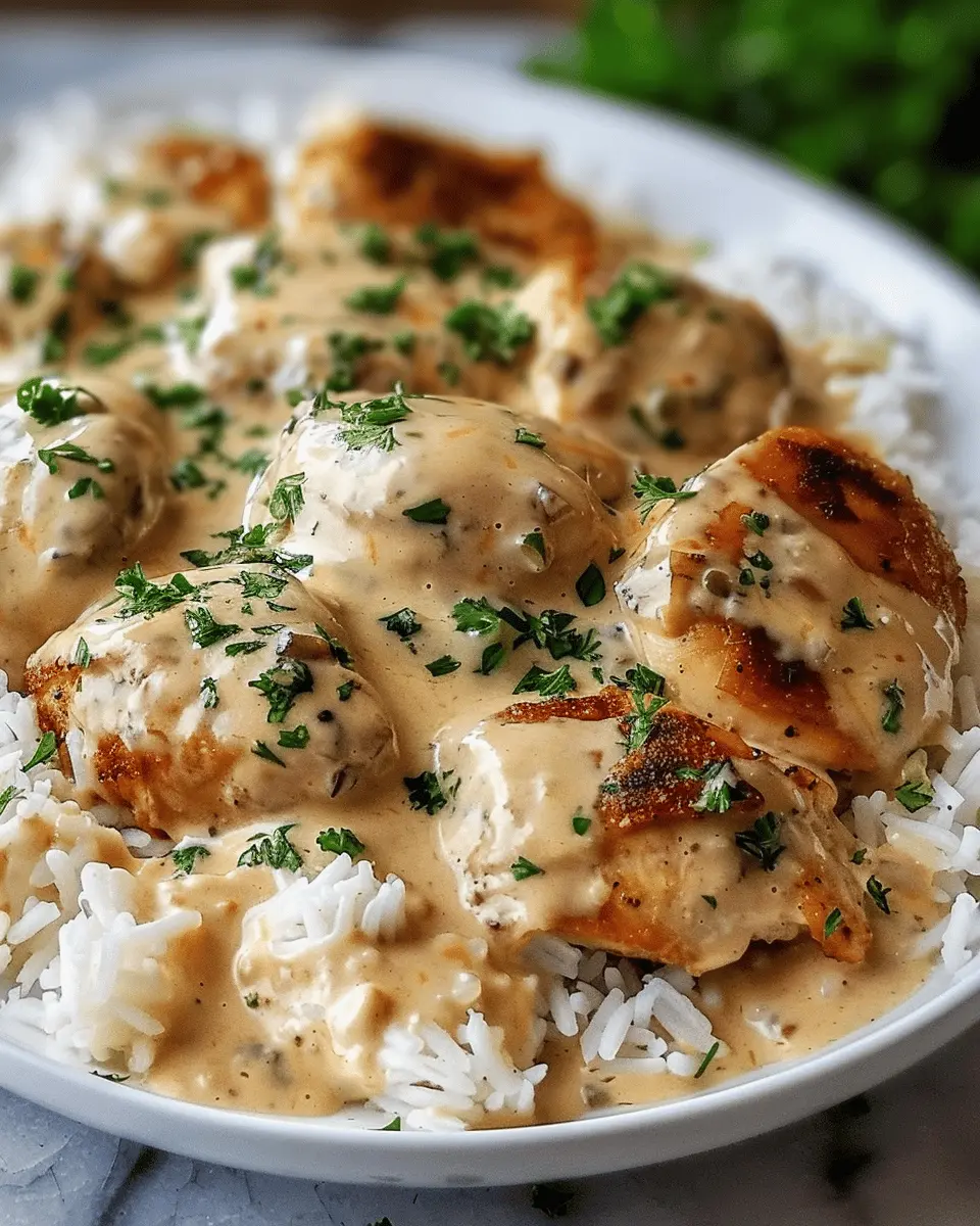 Once the chicken is cooked through, it’s showtime! Carefully plate up a generous scoop of rice and drench your chicken with that creamy sauce. For an elegant touch, sprinkle chopped fresh parsley or chives over the top; not only will this add a lovely pop of color, but it also gives a fresh flavor contrast.