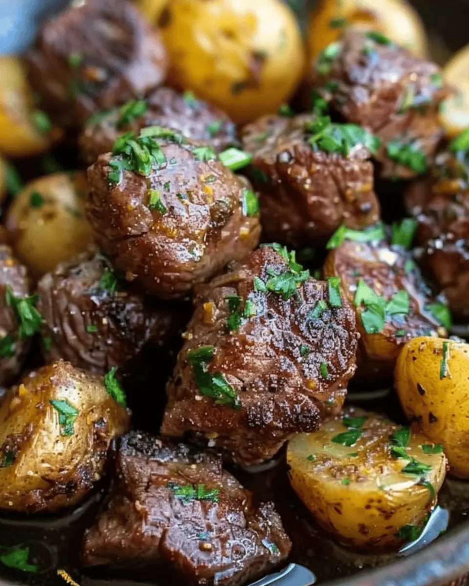 Enjoy the delightful combination of garlic butter beef bites and tender potatoes in this easy comfort food recipe.