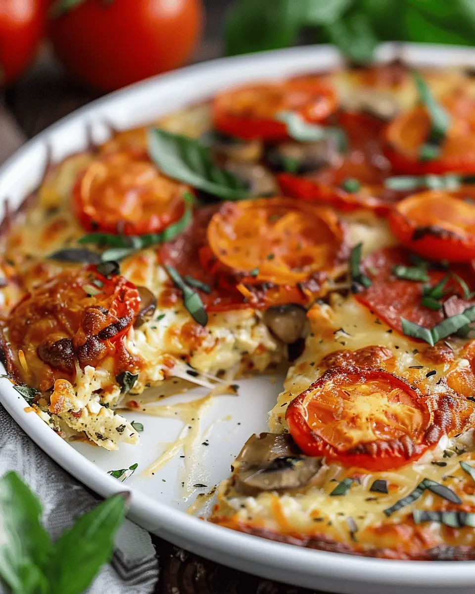 This bake is also customizable; try it with seasonal vegetables or your favorite lean meats, like turkey bacon or chicken ham. Plus, it’s a guilt-free indulgence that satisfies those pizza cravings without the heaviness of traditional options.