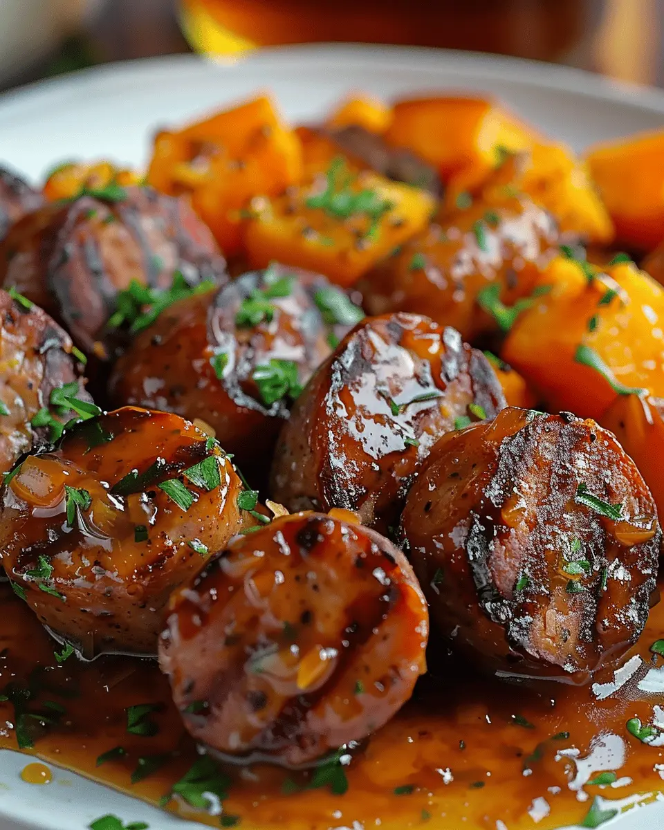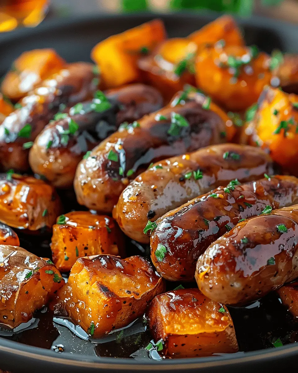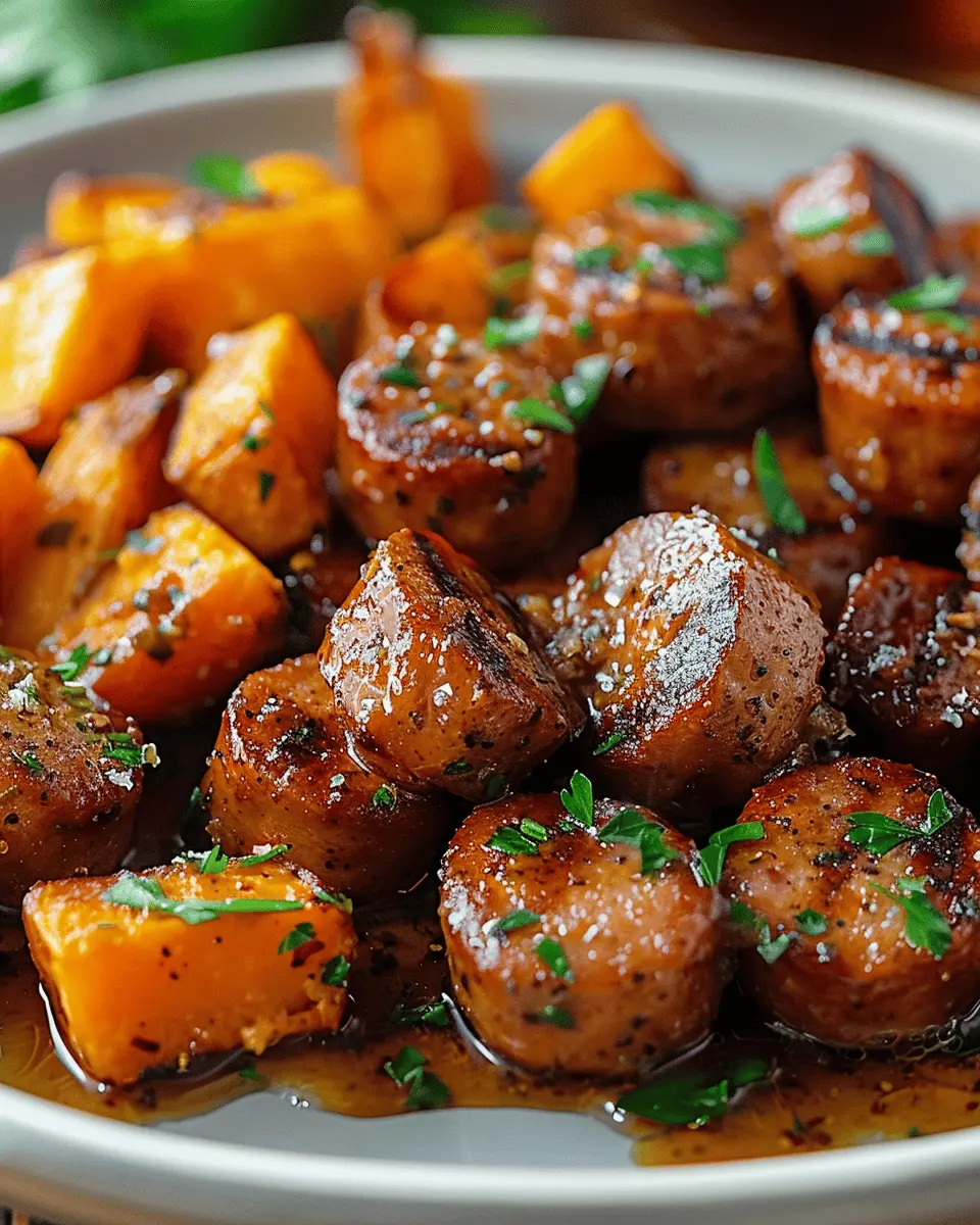 This delicious recipe features savory sausage and sweet potatoes coated in a honey garlic sauce, making it a perfect fall dish.